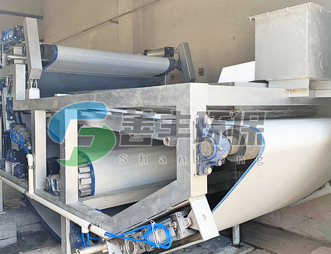 紙漿污泥經輸送泵進入動(靜)態混合器,與同時加入的濃度為0.05~0.1%陰(陽)離子絮凝劑溶液相混合并充分反應后,渣(泥)漿中的微小固體顆粒(或懸浮物)聚凝成體積較大的絮狀團塊,物料間的結合水及表面水被分離成自由水,當物料被輸送鋪展到加長的重力預脫水區(或污泥脫水機上)的濾網上,在重力的作用下自由水透過濾網背面而滲出分離,形成不流動狀態的污泥,達到壓榨脫水區實施壓力條件,然后隨著網帶的移動而夾持在上下兩條網帶之間,經過具有可調張緊力的過濾帶及直徑逐漸遞減的轉輥和對壓輥,實施連續增加的緩慢的對輥擠壓力、剪切力作用,通過楔形區、低壓區、中壓區、高壓區和對輥擠夾區將渣(泥)漿中的水份經過逐級增壓的方式不斷擠壓出來,然后形成含水率較低的濾餅排出,通過刮料板刮離,上下濾帶分開,經過高壓沖洗水及滾刷清除濾網表面孔隙中的微量顆粒,繼續進入下一步脫水循環。