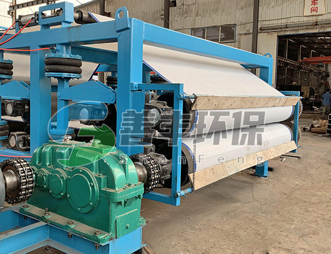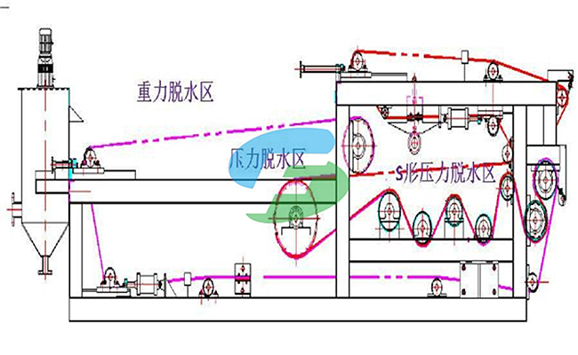 紙漿污泥經輸送泵進入動(靜)態混合器,與同時加入的濃度為0.05~0.1%陰(陽)離子絮凝劑溶液相混合并充分反應后,渣(泥)漿中的微小固體顆粒(或懸浮物)聚凝成體積較大的絮狀團塊,物料間的結合水及表面水被分離成自由水,當物料被輸送鋪展到加長的重力預脫水區(或污泥脫水機上)的濾網上,在重力的作用下自由水透過濾網背面而滲出分離,形成不流動狀態的污泥,達到壓榨脫水區實施壓力條件,然后隨著網帶的移動而夾持在上下兩條網帶之間,經過具有可調張緊力的過濾帶及直徑逐漸遞減的轉輥和對壓輥,實施連續增加的緩慢的對輥擠壓力、剪切力作用,通過楔形區、低壓區、中壓區、高壓區和對輥擠夾區將渣(泥)漿中的水份經過逐級增壓的方式不斷擠壓出來,然后形成含水率較低的濾餅排出,通過刮料板刮離,上下濾帶分開,經過高壓沖洗水及滾刷清除濾網表面孔隙中的微量顆粒,繼續進入下一步脫水循環。