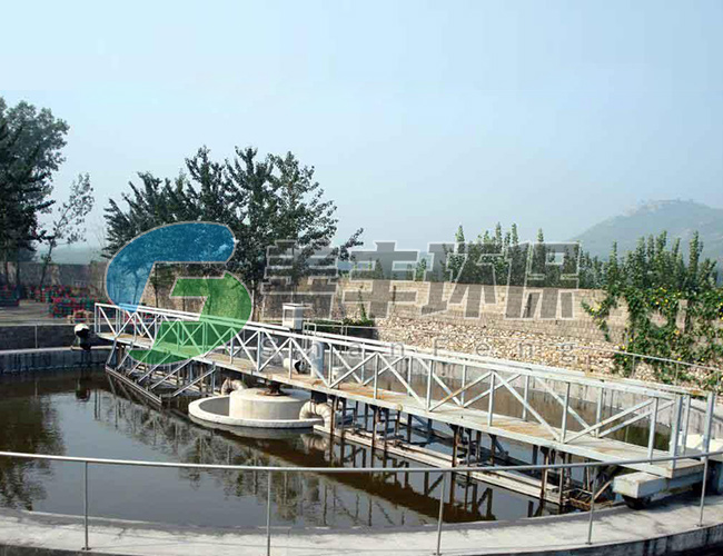 中心傳動驅動機構推動刮泥機構沿中心旋轉,固定于刮臂上的刮板將泥由池邊逐漸刮至池中心的集泥斗中。刮泥板曲線對數螺旋線形,受力均勻,刮泥干凈,當池底遇有障礙時,能自動提耙,保護機器不受傷害,驅動機構可有扭矩保護裝置,工作更加安全。