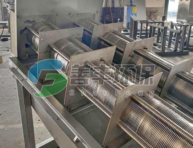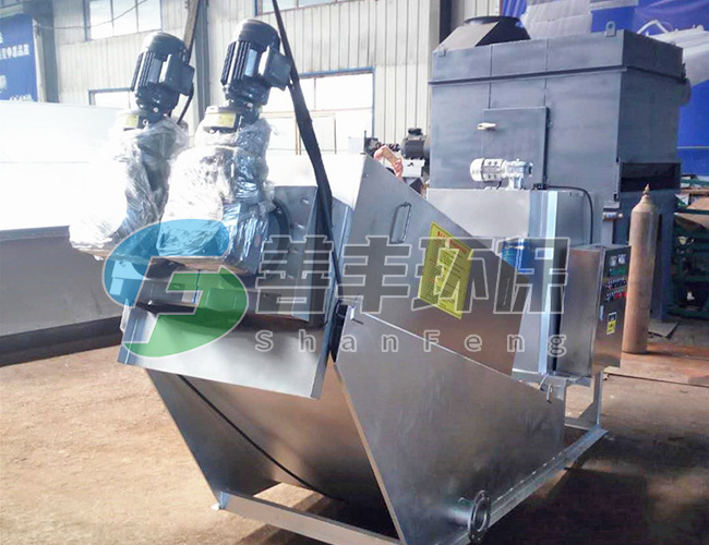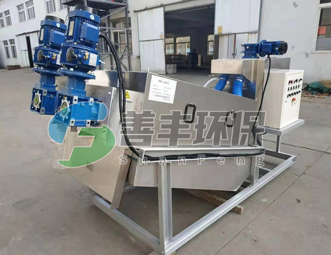 疊螺體包括若干相互疊置的固定環(huán),固定環(huán)的外周均布有多個螺桿,固定環(huán)套裝在螺桿上,螺桿上位于相鄰兩固定環(huán)之間套置有墊圈,相鄰固定環(huán)之間的間隙中還設(shè)置有游動環(huán),疊螺機(jī)固定環(huán)的內(nèi)側(cè)與螺旋葉片間隙配合。工作時,游動環(huán)隨螺旋軸(主軸)的轉(zhuǎn)動而游動,墊圈使得固定環(huán)和游動環(huán)之間始終能保持一定的間隙,避免完全堵死,具有自清作用,無需為防止濾縫堵塞而進(jìn)行大量清洗,減少了沖洗用水量。污泥擠壓技術(shù):為了進(jìn)一步降低濾餅的含水率。