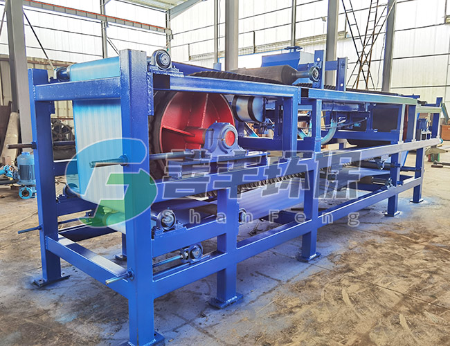料漿由進料裝置均布在向前移動的濾布上,在真空泵的抽濾作用下,濾液穿過過濾布和膠帶過濾孔進入真空箱,再從真空箱下部的連接管道進入濾液罐,固相截留在濾布上形成濾餅。由于重力和真空抽力方向一致,沉降時較大顆粒沉在濾餅之下,小顆粒沉在濾餅之上,形成結構合理的助濾層,其阻力小。過濾速度高。所形成的濾餅隨膠帶而移動被多次洗滌,脫水,然后在濾布轉向處脫落。其后,濾布和膠帶經過驅動轘分開,分別用高壓水清洗再生,濾布經過糾偏裝置調整后,重新回到進料端開始新的作業循環。