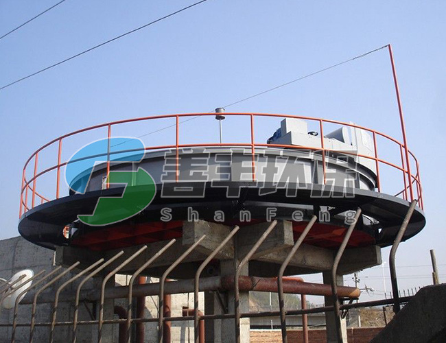 “SF型淺層氣浮裝置針對傳統氣浮池的不足之處,把它的原水進口和凈化水的出口設計為移動式,以縮短原水中氣泡上浮時間,也就是原水流向氣浮池的同時,池中布水管向原水流出的相反方向移動,使進入到池子中的原水基本上處于相對靜止的狀態,這樣水中的氣泡則沿著垂直方向浮向水面,浮起速度接近原水中固形物上浮速度(4~250px/min),因此原水中的懸浮物能很快浮到水面上,而浮渣下的凈化水仍停留在原處,當凈化水集水管移到此處時,凈化水就能排到池外。為了使進、出水口能同步移動,該機設計成圓形,進、出口管安放在轉架上,使它圍繞著中心轉動,這種移動的布水方式產生“零速”。原水中的懸浮物從水中浮到表面的速度快,三分鐘原水就能達到凈化要求。