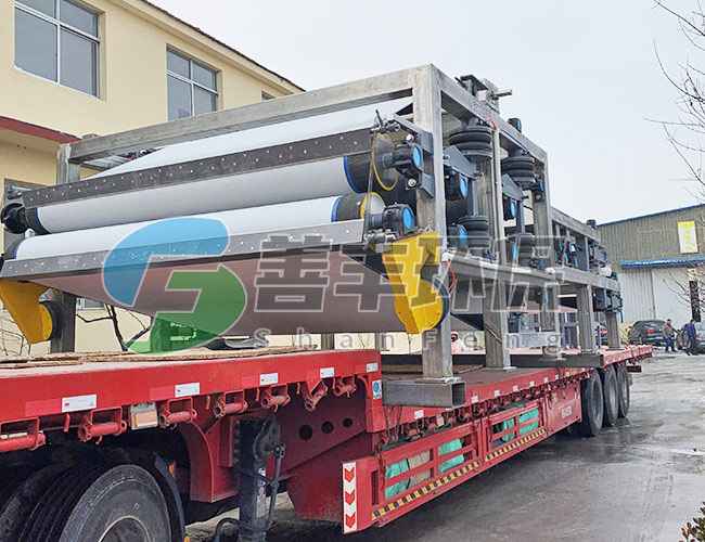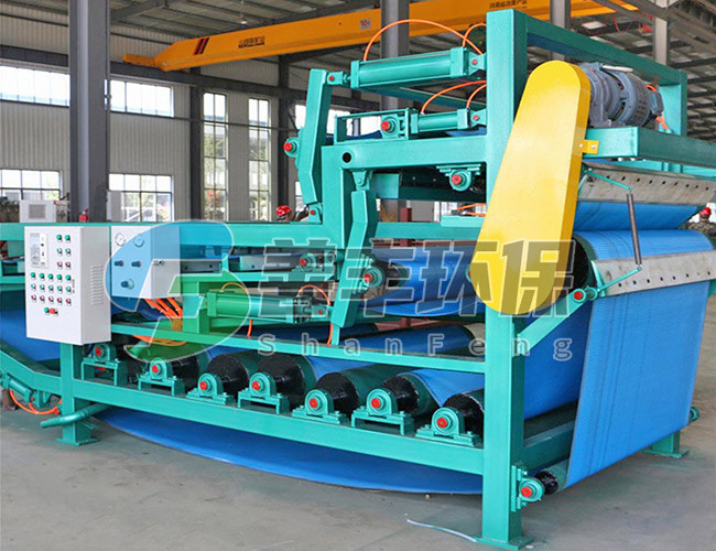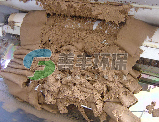 污泥經(jīng)投加凝聚劑后進(jìn)行充分混合反應(yīng)之后流入濃縮段的進(jìn)料分配器,將污泥均勻分布到傾斜式的濃縮段上,并在泥耙的雙向?qū)韬椭亓ψ饔孟拢勰嚯S著濾帶的轉(zhuǎn)動(dòng),迅速脫去污泥的游離水。重力脫水后濃縮污泥經(jīng)反轉(zhuǎn)機(jī)構(gòu)將污泥輸送至帶式壓濾機(jī)的重力脫水段進(jìn)一步脫水。然后喂入“S”形壓榨段,在“S”形壓榨段中,污泥被夾在上,下兩層濾布中間,經(jīng)若干個(gè)不同口徑輥筒反復(fù)壓榨,使污泥再一次脫水,醉后通過刮將泥餅刮落,而上下網(wǎng)在運(yùn)行過程中不斷地被自動(dòng)清洗。